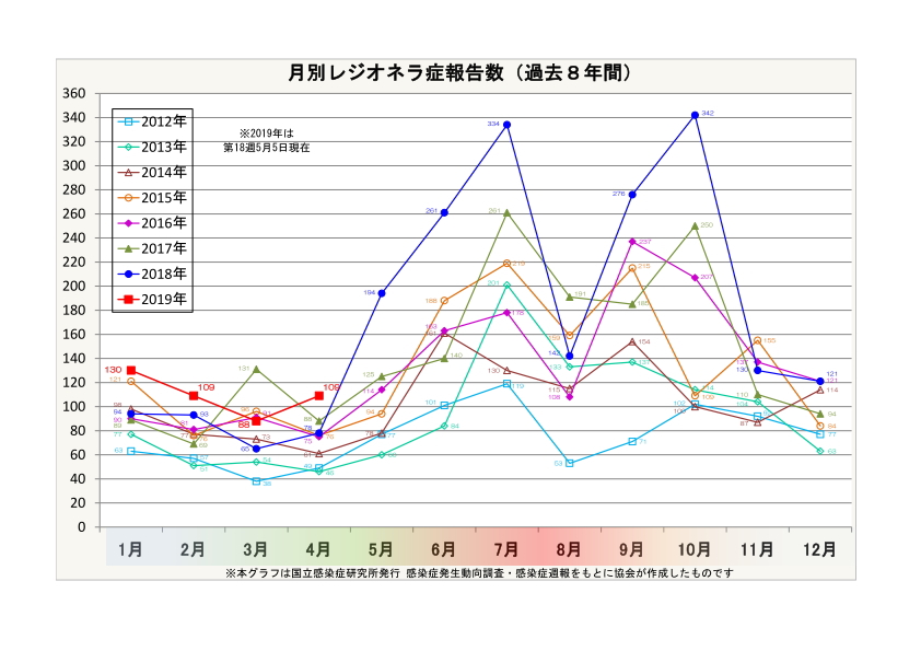 現時点で減少している地域も、暑さが本格化するこれからの時期に増加に転じる可能性があるので、水回りの管理をされている方々は、日々の清掃・消毒を適切かつ継続的に行い、感染者を出さないようにしましょう。