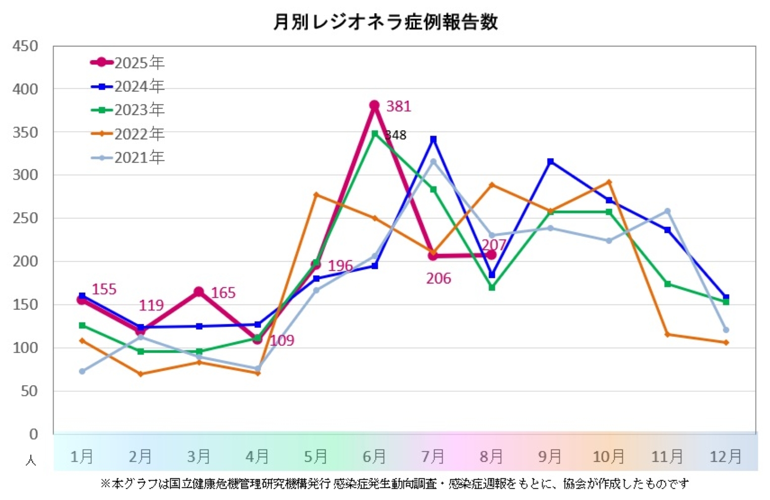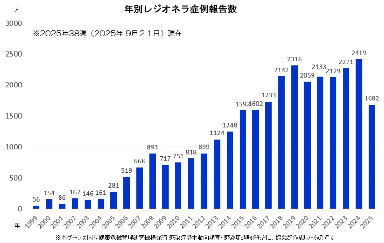 ■2025年 38週まで(2024.12.30 ~ 2025.9.21)のレジオネラ症感染者数