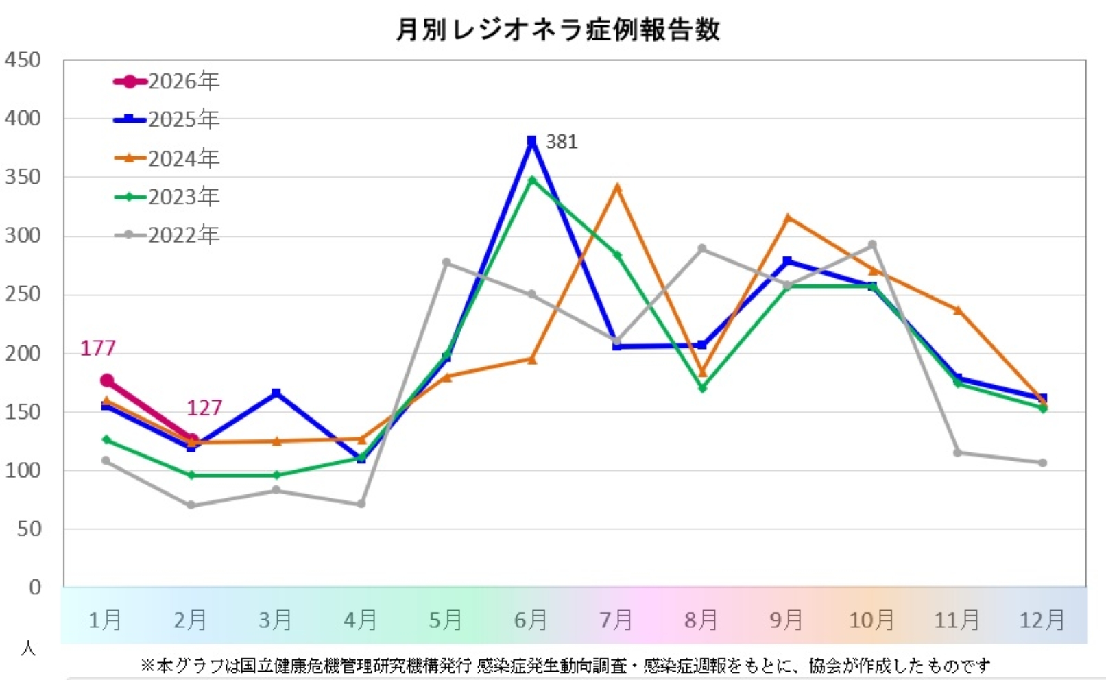 このページのグラフは、国立健康危機管理研究機構(JIHS)が公表する感染症発生動向調査週報(IDWR)のデータに基づき、協会が作成したものです。